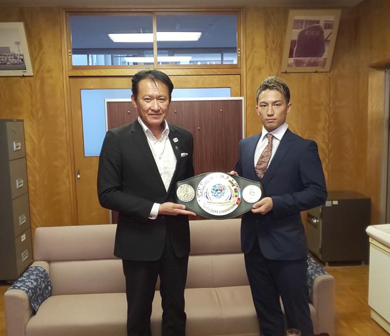 先月,タイ国で行われたムエタイWPMF世界スーパーフェザー級タイトルマッチで見事に勝利し,世界チャンピオンとなった24回生(普通科卒)の岩城悠介さんが,土生校長に表敬訪問されました。