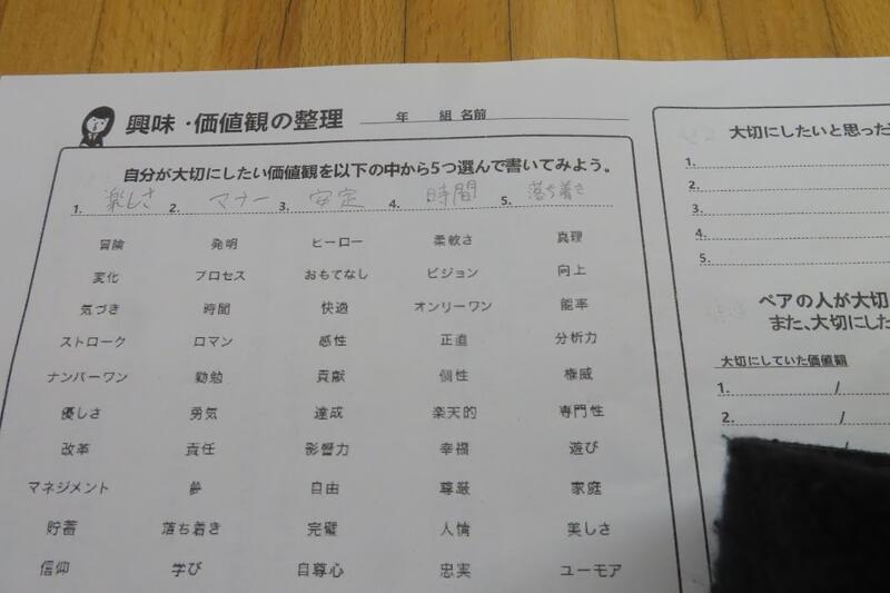 また、部活動やボランティア活動など、学校生活における経験が将来どのように役立つかという話題にも触れられました。生徒たちは、これからの学校生活で何を大切にし、どのような経験を積むべきかを考えながら、ワークに取り組んでいました。自分自身の価値観に基づいてこれからの行動を決めるというプロセスを通じて、生徒たちはこれまで以上に積極的に学んでいこうとする姿勢を見せました。