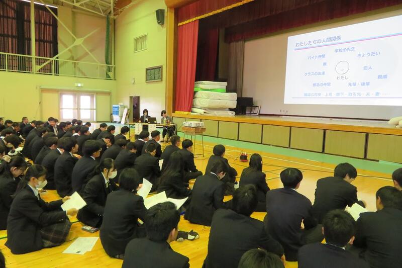 11月27日(水)の6時間目に、本校第一体育館で1学年を対象に保健講話が行われました。今回のテーマは「デートDV予防教育」で、公益財団法人せんだい男女共同参画財団の大柴真紀様と高橋友里恵様を講師としてお迎えしました。