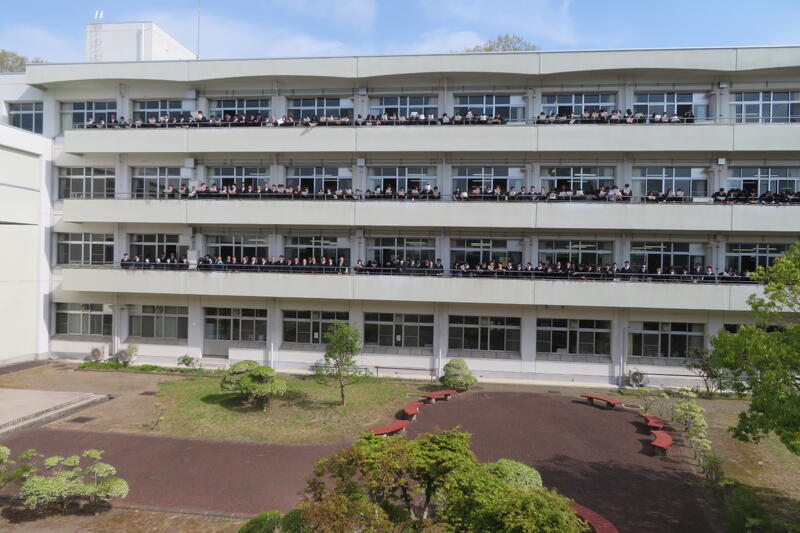 毎朝8時35分になると、校内放送にあわせて校歌が流れ、生徒たちは各クラスごとに練習に取り組んでいます。今年度からは、全クラスがベランダに出て、開放的な空間の中で声を響かせながら歌う形となりました。