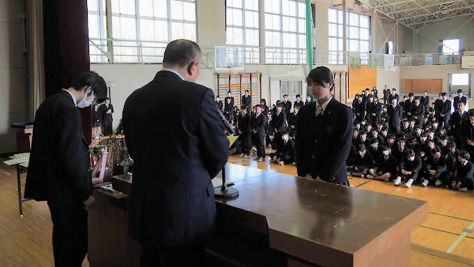 先ほどは、多くの生徒のみなさんに賞状を渡しました。表彰に時間がかかったのは、それだけ多くの活躍があったということです。校長として、大変うれしく思います。3年生からバトンを受け取った新体制のもと、運動部・学芸部ともに、日々の活動に真剣に取り組んでいる姿が見られます。みなさん一人ひとりの努力が、学校全体の活力につながっています。