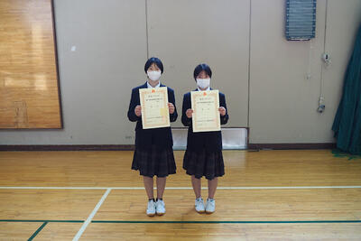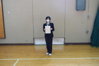 賞状伝達式では、はじめに校内学習賞54名が表彰されました。続いて、部活動において各種大会で優秀な成績を収めた、剣道部、ウェイトリフティング部、柔道部、書道部、陸上競技部、女子ソフトテニス部の生徒が表彰され、日頃の努力と成果が称えられました。会場では、生徒一人ひとりの活躍に対して、温かい拍手が送られました。