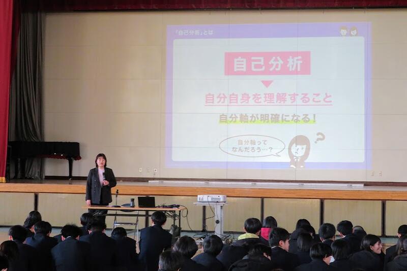 12月10日(水)6校時、体育館にて1学年を対象とした「志教育(第2回)」を行いました。講師に株式会社ジンジブキャリア教育開発部の和田寿子氏をお招きし、「自己理解~興味・価値観の整理」をテーマにお話しいただきました。